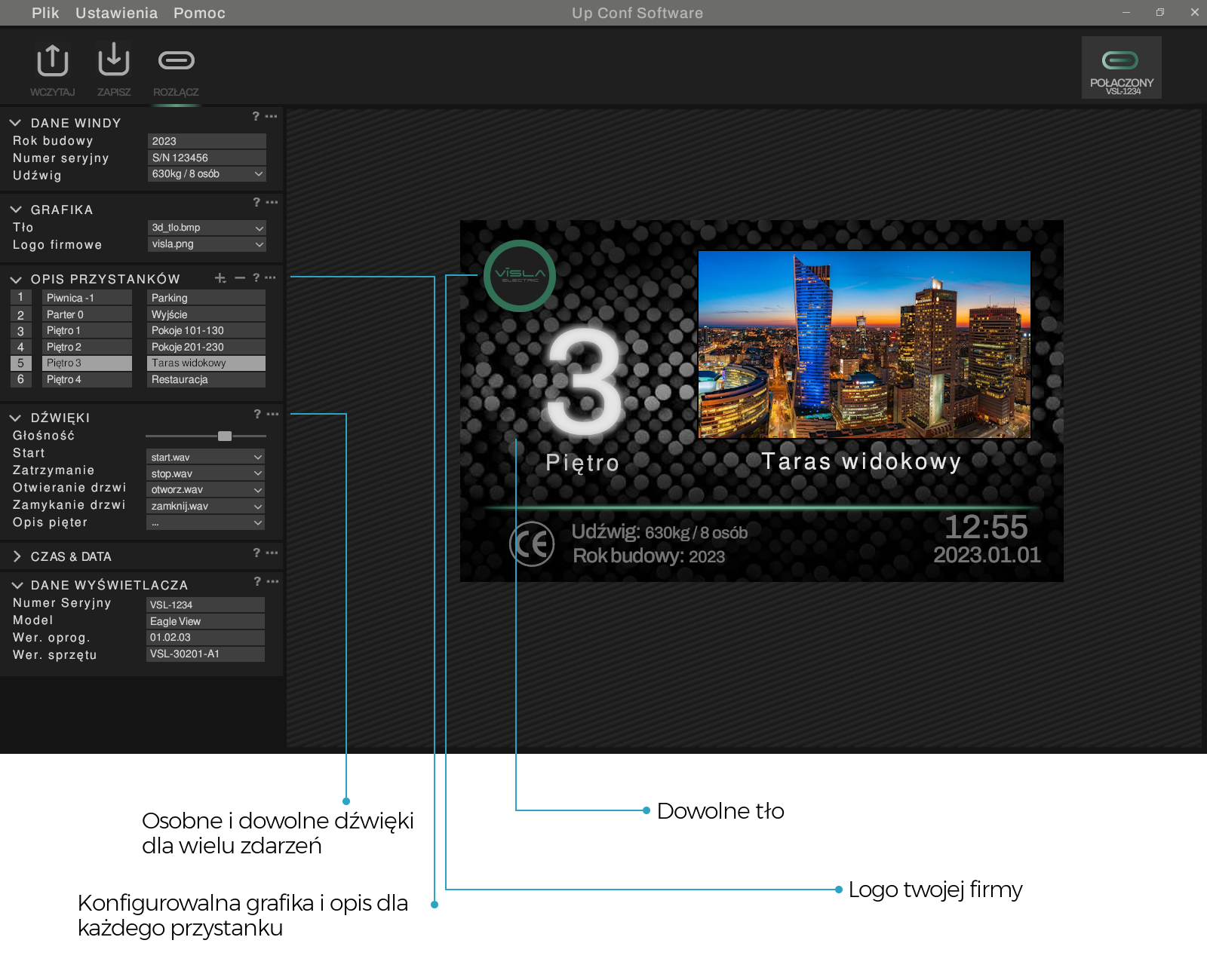 | Konfiguracja graficzna | Konfigurowalne: przystanki, czas, kierunek jazdy, tło i wiele innych |